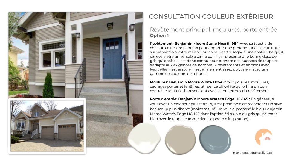 - Recommendations de 2 combinaisons couleur pour le revêtement, la porte d’entrée principale, les moulures.