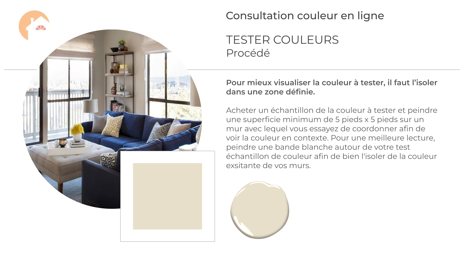 - Tous les éléments fixes intérieurs: planchers, tuiles, comptoirs, dosserets etc, doivent déjà être installés car tous ces éléments doivent être pris en considération pour être en mesure d’identifier leur sous teintes et recommander les couleurs de peinture qui s’harmoniseront parfaitement.